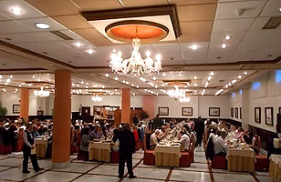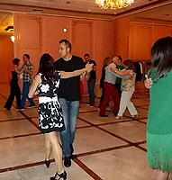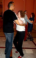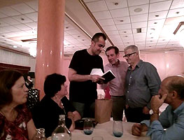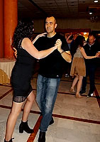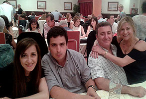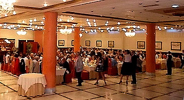 La primera parte de la velada siguió el guión habitual en las cenas fin de curso de estos últimos años: lucha a brazo partido por los mejores asientos (en realidad son todos iguales), zampilona generalizada de los manjares que nos sirvieron (ver fotos), regalos y homenajes a los profes (esta vez me tocó uno: ¡gracias, grupos de los lunes!), recaudación ejecutiva bandeja en mano (el que no pague no baila: no hay amenaza más eficaz, los billetes vuelan), cafés (esta vez no hubo chupitos, nos fuimos directos a los cubatas) y... ¡a bailar! A pesar de ser más que nunca, también batimos todos los récords en cobrar, contar la pasta y entregarla, así que hacia las 12 menos cuarto de la noche ya estábamos todos bailando pasodobles, merengues, bachatas, cumbias, chachachás, boleros, valses y cualquier otro ritmo que saliera de los altavoces. En realidad, el gran fallo de la noche fue que todas las fotos que tiramos nosotros salieron chungas al ampliarlas se nota más por un error tonto al ajustar la resolución de la cámara. ¡Esto con las analógicas no pasaba! En fin, el caso es que, a consecuencia de ello, esta vez hay menos imágenes en el reportaje (sobre todo, desplegables) y la calidad de muchas de ellas deja bastante que desear... Hemos hecho lo que hemos podido, o en palabras de Cyberto, nuestro as tecnológico: 'Esto es lo que pasa cuando le das una máquina compleja a un ceporro'.