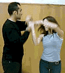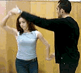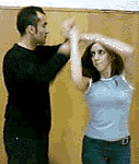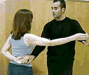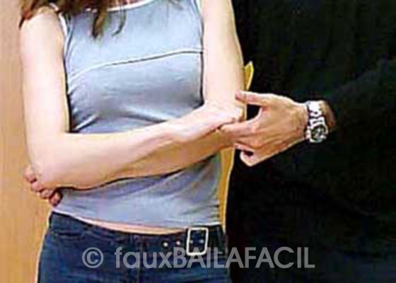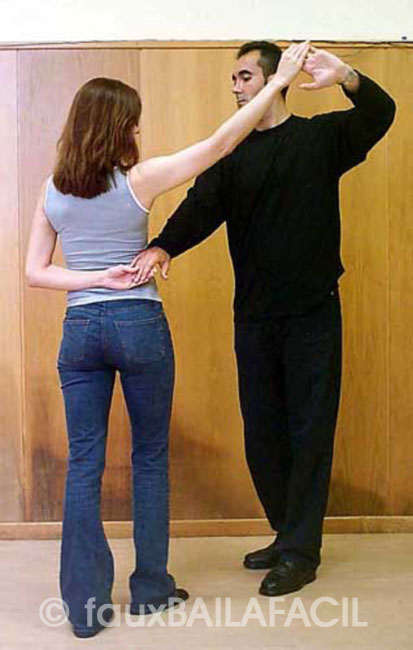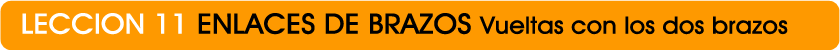 Nosotros llamamos enlaces de brazos a los giros que la chica realiza delante del chico mientras éste la sujeta por ambos brazos. En las vueltas una de las manos de la chica permanece libre, pero durante los enlaces ambas permanecen cogidas a las del chico todo el tiempo, si bien al menos una de ellas ha de rotar para permitir el giro. Aunque las tres posibilidades básicas de enlace son relativamente simples, éste es un tipo de movimiento con multitud de variantes, lo que puede dar lugar a importantes 'lios' en la pista de baile. No tenemos espacio aquí para ocuparnos de todas ellas, pero ten en cuenta que el chico puede hacer los mismos enlaces que la chica, que todas las posiciones enlazadas tienen dos salidas por arriba y por abajo, que también se pueden realizar con los brazos en posición cruzada y combinarlas entre sí y con las vueltas a una sola mano. En todo caso, los enlaces de brazos sólo se pueden hacer con ambas manos agarradas, es decir, en la posición baja de baile. LOS TRES ENLACES BASICOS Hay tres opciones básicas para 'enlazar', según la forma en que dispongamos los brazos. Si levantamos ambos, el resultado no es muy distinto de una vuelta a una mano, excepto que los brazos quedan trabados y hay que deshacer la posición de inmediato. La segunda opción es levantar sólo uno y dejar el otro abajo. En ese caso, se dice que la chica queda 'envuelta' y hay dos posibilidades, según hayamos llegado a la posición mediante un giro por detrás o por delante. Antes de examinar con mayor atención estos tres enlaces básicos, queremos recordarte que la nomenclatura que utilizamos no es universal y puede que encuentres los mismos movimientos bajo nombres diferentes en otros sitios: VUELTA