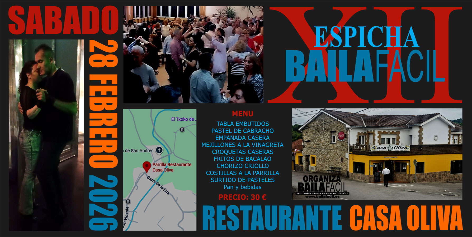 26/01/2026 La duodécima Espicha BAILAFACIL ya está en marcha, amigos. Este año la celebraremos en Casa Oliva, un restaurante parrilla a las afueras de Gijón donde nunca hemos organizado uno de nuestros eventos hasta ahora. Su precio es de 30 € y puede apuntarse cualquiera, pero nuestros alumnos tendrán preferencia si se supera el aforo previsto. El único método válido de inscripción para no alumnos es llamar al 985 38 90 19, preferiblemente por las mañanas. El evento se desarrollará entre las 21:30 horas y las 3:00 de la madrugada. Su menú y demás detalles están en el CARTEL sobre estas líneas.